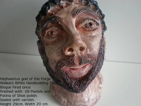 The most inspiring god as he is physically lame and is thrown from Mt Olympus because he made a throne for his mother Hera in which she was unable to get out off. She cursed him to walk on earth among the human mortals. He taught them metal crafts and is not just the god of the forge but the god of volcanoes. All my pieces I had to drag from the physical plan of earth of soil and clay from this land Australia and memory of how ancient this land is with all the knowledge of the ancient and longest surviving culture and people on this planet , the indigenous of this country. It is in his capacity of volcanoes his presents here in this land. But that is my own interpretation, as I can not presume the right to claim the history of that ancient long surviving culture as I am not native to this land only born here with white woman’s eyes and ears, and brain/ mind.